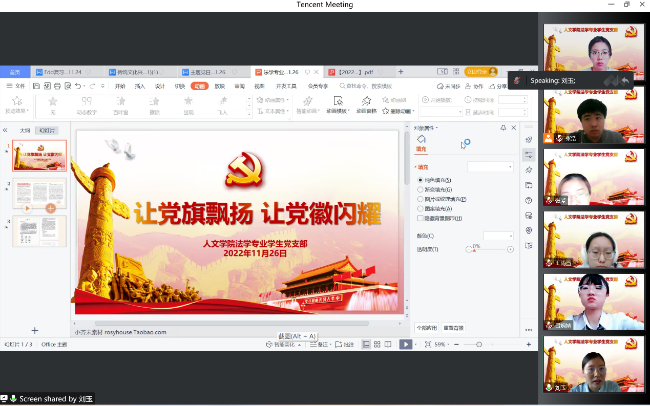2022年11月26下午2点,yl23455永利官网法学专业学生党支部在通过腾讯会议的方式开展“让党旗飘扬,让党徽闪耀”主题党日活动。本次活动分为深入学习贯彻二十大精神、学习廉政建设和打赢疫情防控阻击战三方面的内容。活动由yl23455永利官网法学专业学生党支部书记刘玉老师主持,联系党支部的领导宣传部副部长曾宇平、yl23455永利官网党委书记杜伟、法学专业学生党支部全体党员及部分入党积极分子参与活动。
