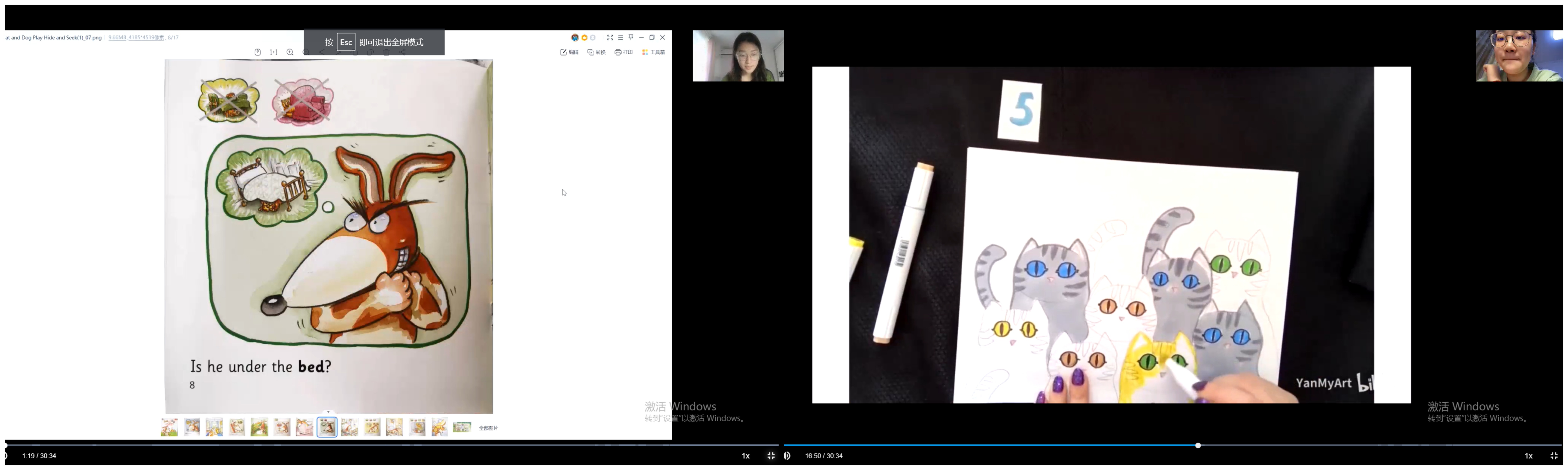 活动正式开始后,在志愿者的带动下,小朋友们首先进行了自我介绍,在这个过程中,孩子与志愿者们相互熟悉,课堂变得活跃起来。随后,19级英语(医学)班学生党员吴言同学带孩子们学唱冬奥开幕式主题歌《雪花》(snowflakes)英文版,歌曲简单易学、旋律优美,小朋友的热情瞬间被点燃,有模有样地跟着学唱,稚嫩的声音十分动听。接下来,主讲老师带领孩子们学习英文绘本,这次所学绘本的题目为“猫狗捉迷藏”。在讲解之前,小朋友们观看了导学动画片,对内容有了一定了解。之后,主讲老师带领孩子们分节段地学习绘本内容,跟读学习英语单词,在这之中,老师展示相应的图片、小玩具,加深孩子们的印象,同时,老师还不时与孩子们做游戏,邀请孩子们进行现场表演、分角色对话等等,极大地丰富了活动形式,调动了现场氛围。孩子们时而动情地微笑着、时而积极地举手回答问题,气氛相当热烈。最后,孩子们观看了趣味美术视频,边欣赏作画的同时,边听着主讲老师的英文讲解,孩子们最后也拿起画笔,投入到绘画的乐趣中。