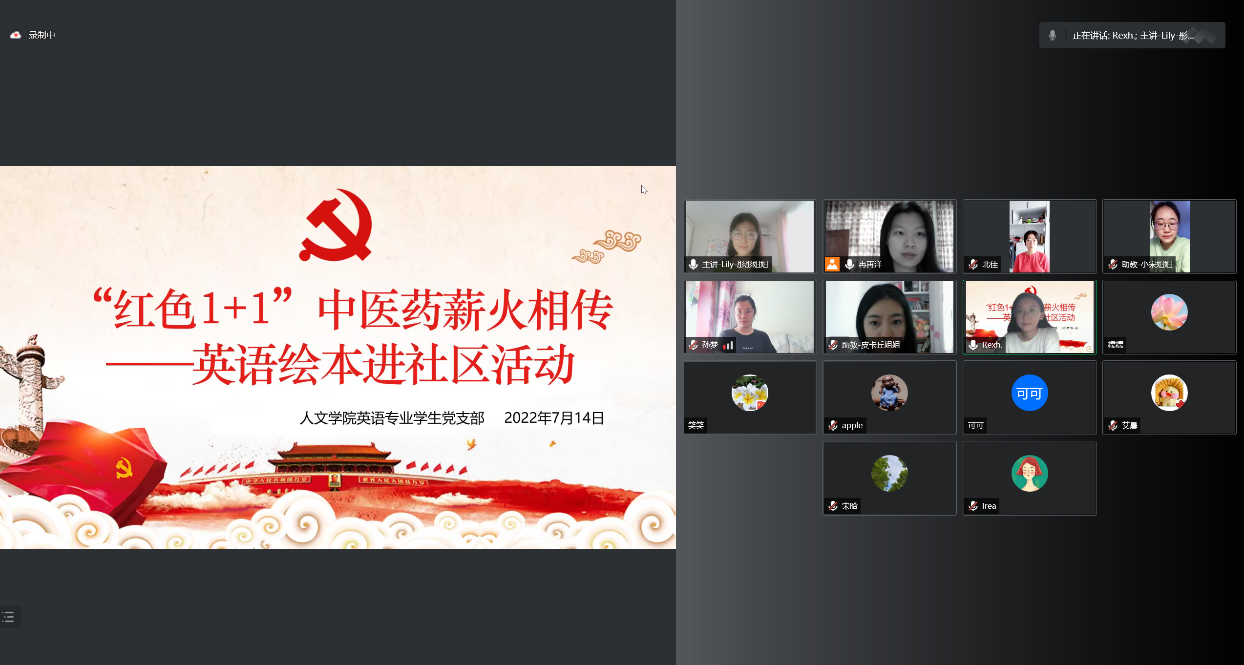 为响应“中医药振兴发展”的号召,增强党员与群众的联系、强化服务意识,2022年7月14日,yl23455永利官网英语专业学生党支部联合房山区西潞街道海逸半岛社区党总支开展“红色1+1”中医药薪火相传------英文绘本进社区系列活动。本次活动采用线上腾讯会议的形式举行,共计十四人参与,其中志愿者八名,来自社区的家长和小朋友共六名。活动以英文绘本为主要教学材料,辅以网络优质资源丰富活动形式,由志愿者主讲,以互动方式带动孩子们积极参与,活动内容包括为自我介绍、歌曲学唱、绘本阅读和趣味绘画。