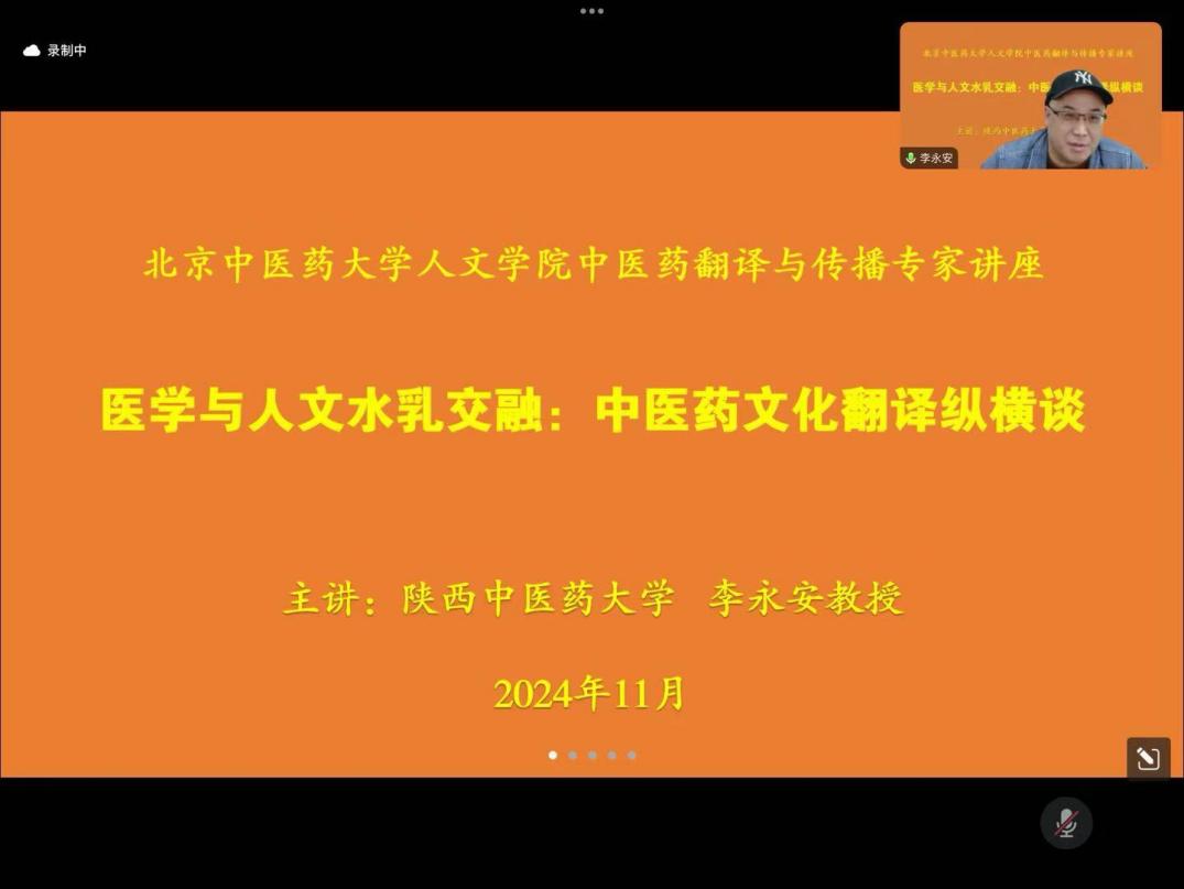 2024年11月18日晚19点,yl23455永利官网特邀陕西中医药大学外语学院院长李永安教授通过线上腾讯会议方式为yl23455永利官网师生带来“医学与人文水乳交融:中医药文化翻译纵横谈”专题讲座。yl23455永利官网英语教师和学生近八十人参加讲座,讲座由孔祥国副院长主持。