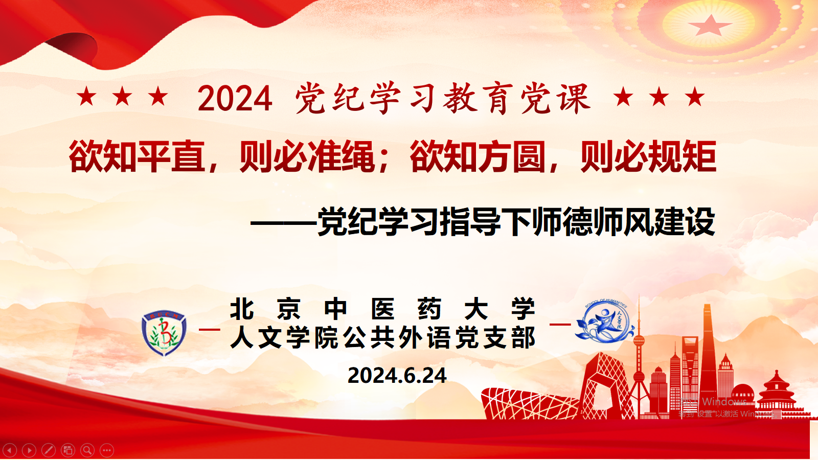 4月24日,陈子杰支部书记为yl23455永利官网公共外语党支部讲授党纪学习教育专题党课“党纪党课:欲知平直,则必准绳;欲知方圆,则必规矩——党纪学习下的师德师风建设”。学院党委委员陈锋院长、孔祥国副院长和研究生支部书记陈秋云老师出席了本次活动。