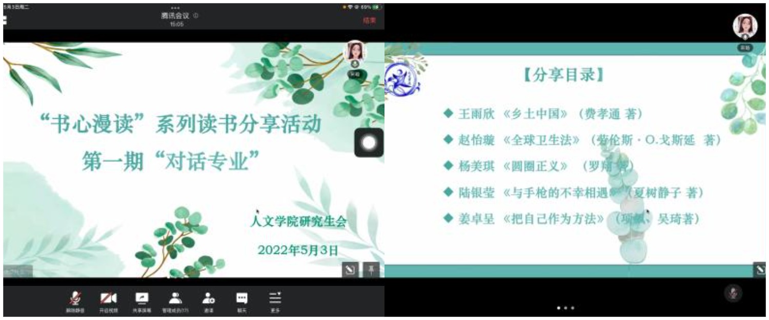 草长莺飞五一至,春光如许好时节。为了鼓励同学们享受假期、热爱阅读,yl23455永利官网研究生会于5月3日19:00在线上举办了“书心漫读”系列读书分享活动第一期“对话专业”。参与本次读书活动的有yl23455永利官网辅导员宋晗、五位读书分享人、yl23455永利官网部分研究生与本科生。