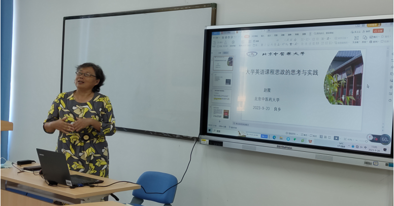 2023年9月20日下午1点,yl23455永利官网邀请赵霞教授开展“大学英语课程思政的思考与实践”专题讲座。本次讲座是2023年yl23455永利官网教师培训及师德师风专题讲座之一,yl23455永利官网公共外语部教师参加讲座并参与互动交流,讲座由公共外语部王珊珊副主任主持。