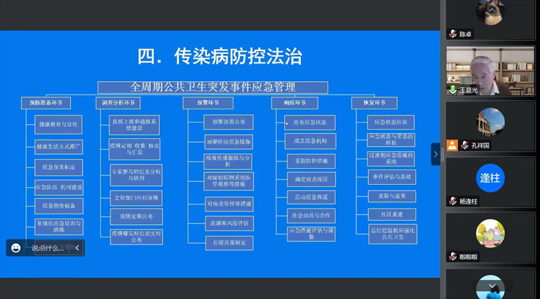 讲座过程中,王教授结合习近平总书记“要把人民健康放在优先发展的战略地位,以普及健康生活、优化健康服务、完善健康保障、建设健康环境、发展健康产业为重点,加快推进健康中国建设”的论述,以我国“健康中国”战略为核心,结合当前疫情防控的主要特点与任务,对我国卫生法学学科发展中与国家治理体系中的传染病防控法治做出五个方面的具体讨论。主要内容包括:一、“健康中国”作为国家战略的地位;二、以卫生健康法治保障“健康中国”战略的实施;三、“大健康”观念的转变与实现;四、当前我国传染病防控法治体系的构建及基本原则;五、把健康权融入社会发展的重要性及典型案例。同时,王教授在讲座过程中结合yl23455永利官网系部设置与愿景规划,对法学及英语专业在我国中医药“走出去”过程中的重要作用及当前人才培养需求进行了展望。