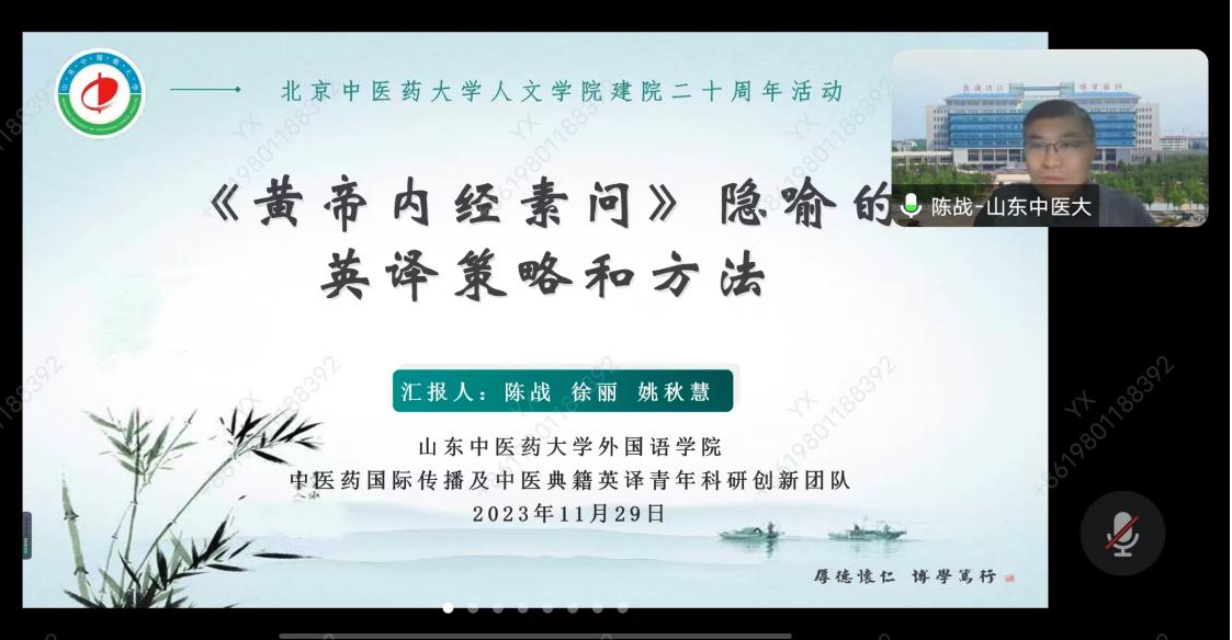2023年11月29日晚19点,yl23455永利官网特邀山东中医药大学陈战教授通过线上腾讯会议方式为yl23455永利官网师生带来yl23455永利官网建院二十周年系列活动之“《黄帝内经·素问》隐喻的英译策略和方法”专题讲座。yl23455永利官网英语教师和学生近七十人参加讲座,讲座由孔祥国副院长主持。
