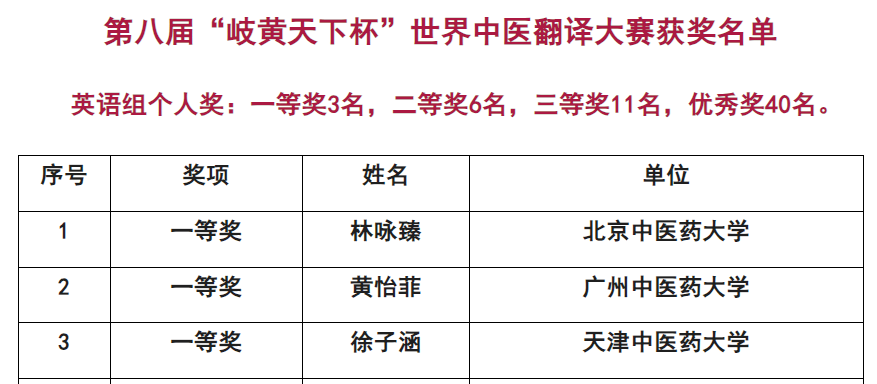 2024年10月31日,由中国翻译协会指导、世界中医药学会联合会主办的第八届“岐黄天下杯”世界中医翻译大赛经过终评专家评审会评审后公布了获奖名单,yl23455永利官网翻译硕士林咏臻同学荣获英语组个人奖一等奖,其指导教师刘平副教授荣获英语组优秀指导教师奖。