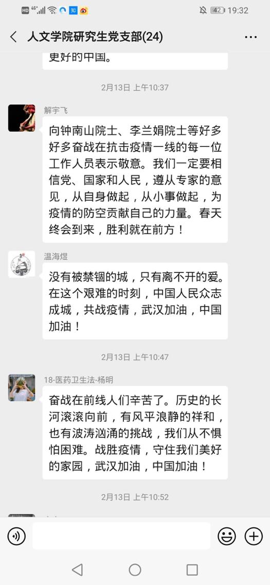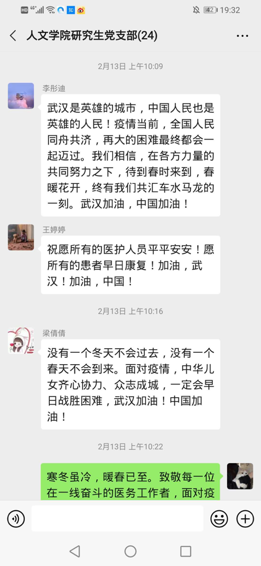 尽管受限于疫情的影响,无法给予前线拼搏的工作人员及受难的同胞直接的帮助,但是疫情无法隔绝关爱,研究生党支部各党员同志纷纷以文字、图片、或视频的形式表达了对于武汉、对于祖国的关心与祝福,为远方的人祈福,为各自加油鼓气。