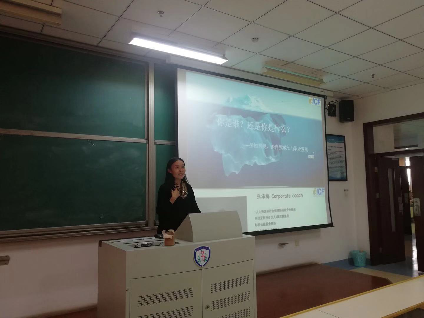 张海梅老师首先以介绍自己标签的方式与学生们互动,接下来张海梅老师通过解读不同年龄段人群的成长困惑、行业发展现状等,从不同视角来探索个人成长的最终点落脚点。通过案例告诉学生们一方面要认识自己的兴趣,发掘潜力,在工作中找到获得感;另一方面未来就业也要考虑职业价值观与自己价值观的契合度,找到适合自己的职业。无论是组织还是个人,只有充分地回答了“我是谁”,清晰地认知了自我,才有可能实现真正意义上的成长和发展。最后,张海梅老师介绍了认识探知自我的工具模型,帮助学生建立起认知自我的意识,奠定职业成功的基础。