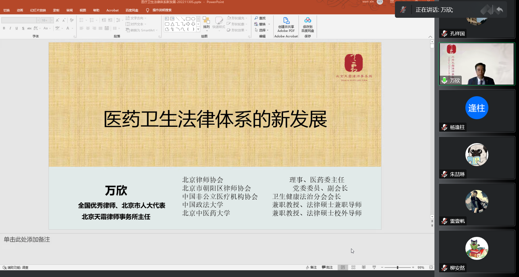 2022年11月30日下午,yl23455永利官网邀请全国优秀律师万欣进行“医药卫生体系新发展”主题讲座。讲座以线上腾讯会议形式进行,由法律系主任杨逢柱主持,孔祥国副院长致辞,yl23455永利官网师生50余人在线聆听讲座并积极参与互动讨论和交流。