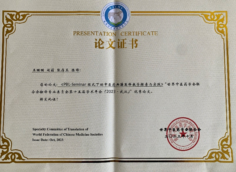 王珊珊副教授为第一作者、陈锋院长为通讯作者的论文《PBL-Seminar模式下的中医药典籍英译教学探索与实践》,介绍了我校翻译硕士(MTI)创新型、特色化专业课程《中医药典籍英译》的开设及建设情况,获得本届大会优秀论文奖。