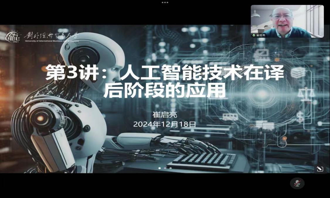 2024年12月18日晚19点,yl23455永利官网特邀对外经济贸易大学崔启亮教授通过线上腾讯会议方式为yl23455永利官网师生带来系列讲座第三场之“人工智能技术在译后阶段的应用”专题讲座,讲座由孔祥国副院长主持。