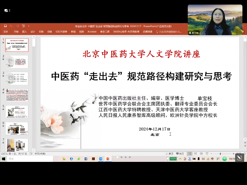 2024年12月17日上午,yl23455永利官网特邀单宝枝编审通过线上腾讯会议方式为yl23455永利官网师生带来“中医药‘走出去’规范路径构建研究与思考”专题讲座,讲座由陈锋院长主持。