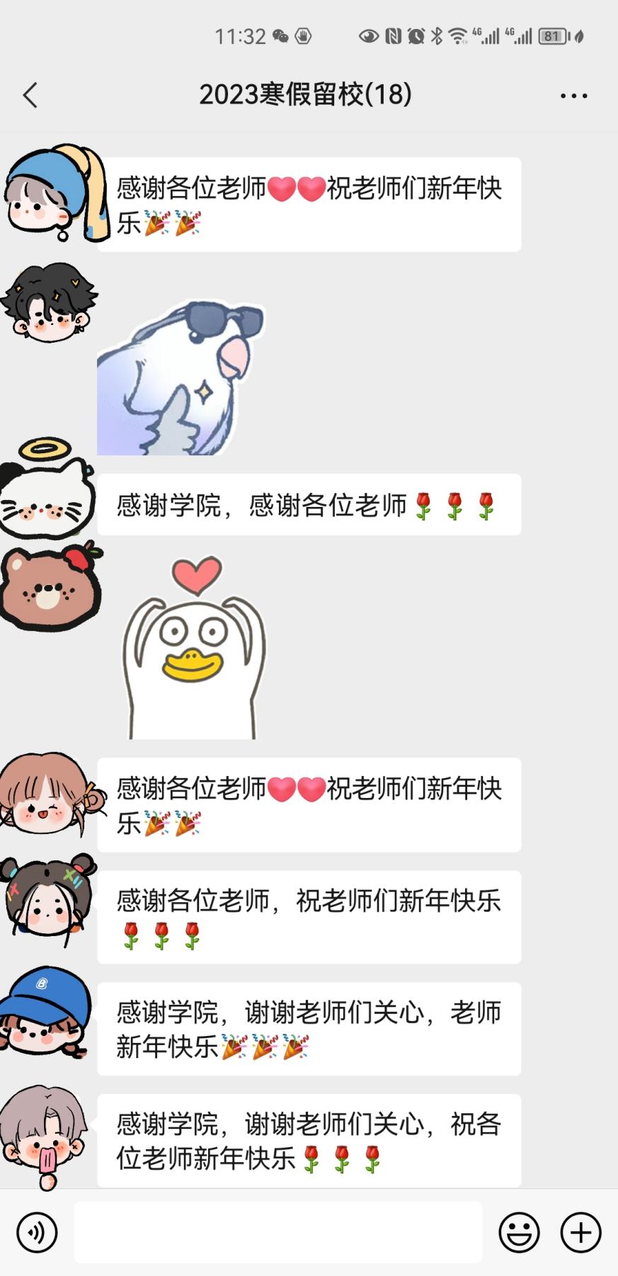 新春慰问寄真情,浓浓关爱暖人心,学生不离校,温暖不缺位。学院也将根据留校学生的实际情况给予相应的关怀与帮助,尽心尽力为留校学生的学习和生活提供有温度、有质量的服务保障,确保同学们在校度过一个欢乐祥和、平安健康的新春佳节。