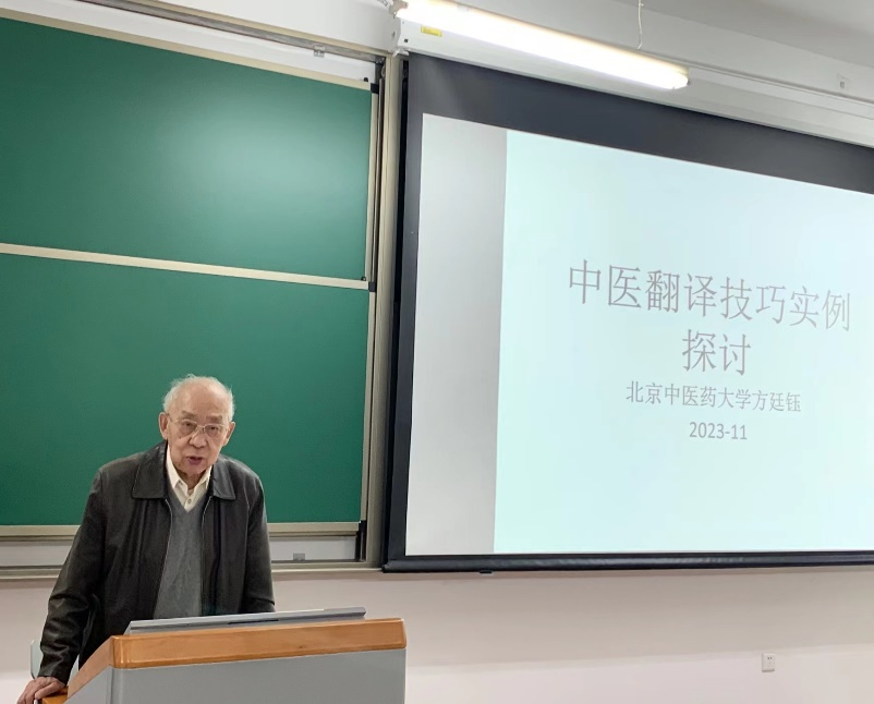 2023年11月4日下午,yl23455永利官网在和平街校区学八楼202室开展了一场别开生面的“中医翻译大师课”——邀请我校中医药外语专业知名老专家方廷钰教授为在校研究生主讲“中医翻译技巧”专题讲座。讲座由永利官网王珊珊副教授主持。方教授基于自身丰富的中医药外语翻译理论与实践经验,用生动而形象的专业语言,为北中医学子传授了中医药翻译的技巧和心得。这不仅是一次专业知识的传授,更是一次温暖而深入的人文交流。