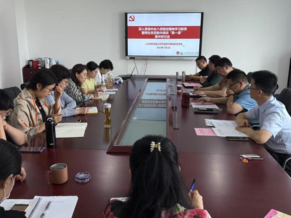 2025年7月2日,公共外语部与英语系党支部召开深入贯彻中央八项规定精神学习教育暨师生党员集中培训“第一课”集中研讨会。支部全体党员,联系支部的校领导闫振凡副校长,yl23455永利官网党委书记张小勇、院长陈锋、党委副书记吴涛参加研讨会。会议由支部书记陈秋云主持。