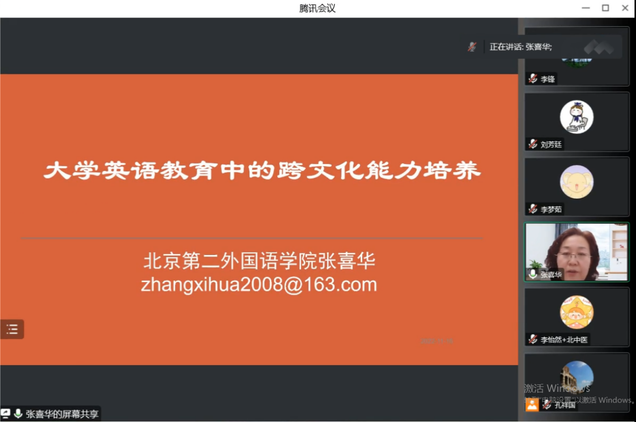 2022年11月16日下午,yl23455永利官网邀请教育部大学外语教学指导委员会委员、北京高校大学英语教育发展中心主任、北京市教学名师、北京第二外国语学院博士生导师张喜华教授为yl23455永利官网教师带来“大学英语教育中的跨文化能力培养”专题培训讲座。讲座由孔祥国副院长主持,公共外语部及英语系教师在线聆听讲座并积极参与讨论。