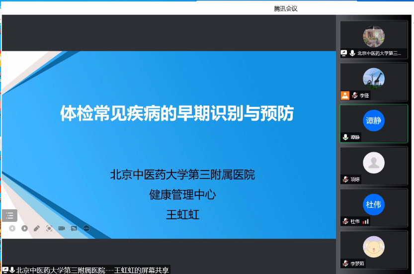 疫情期间做好自我防护关爱身体健康,2022年5月13日上午yl23455永利官网邀请了yl23455永利官网第三附属医院健康管理中心王虹虹主任,通过腾讯会议线上顺利举办了健康讲座,yl23455永利官网的教职工积极参与。本次讲座旨在帮助教师们重视和按时进行健康检查,做到“未雨绸缪”、“防患未然”,让教师们未来能健康的生活和工作。