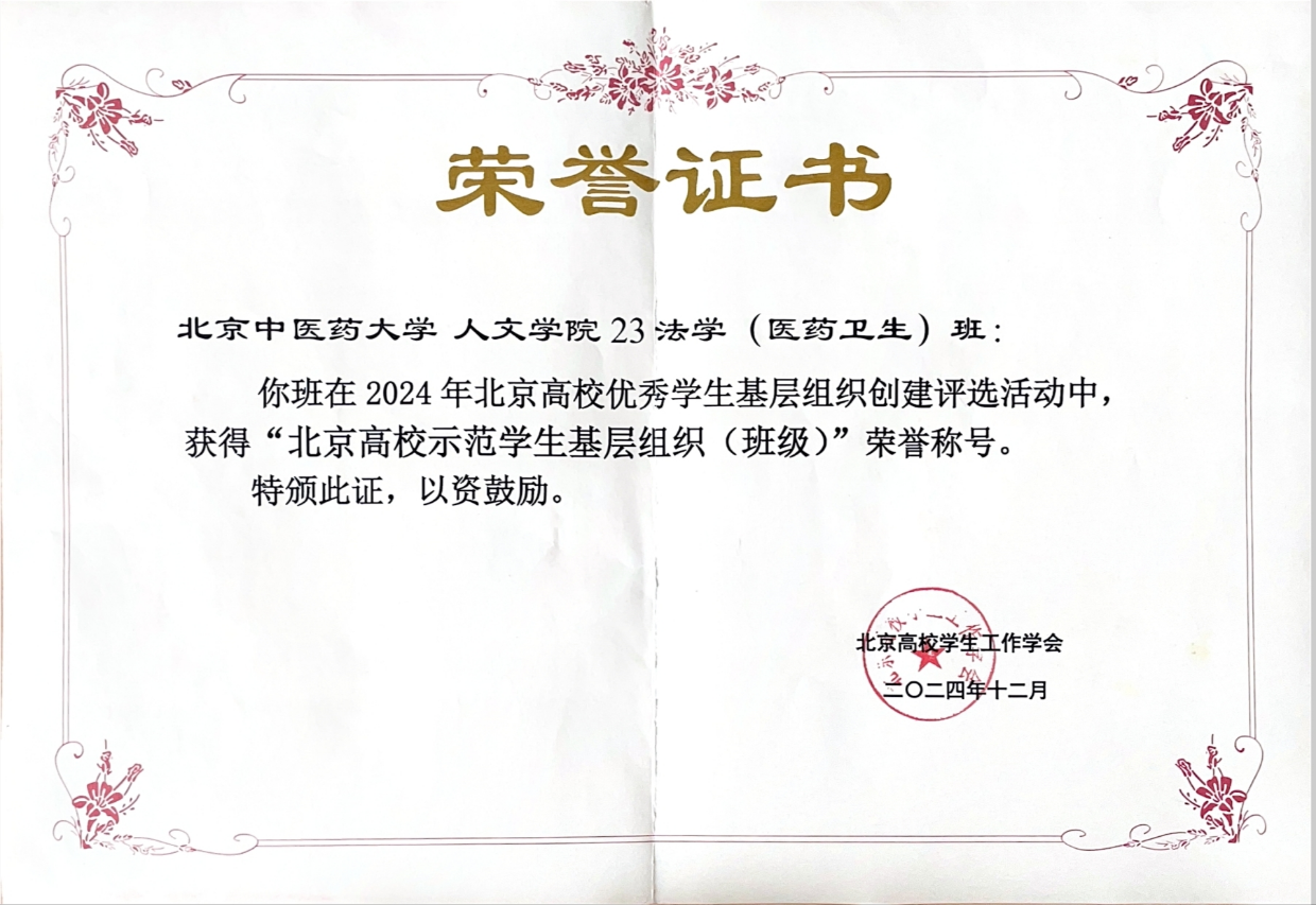 在北京高校学生工作学会开展的“2024年北京高校优秀学生基层组织创建评选活动”中,yl23455永利官网23法学(医药卫生)班荣获“北京高校示范学生基层组织(班级)”荣誉称号。这是学院紧紧围绕立德树人根本任务,扎实推进学生基层组织建设的重要体现,也是该班全体师生努力的成绩,更是对23法学班未来继续前进、追求卓越的极大肯定。此前,校内评选活动中,23法学班还获得yl23455永利官网2023-2024学年校级“十佳班集体”荣誉称号。班主任宗倩倩老师因工作成绩优异,也同时荣获yl23455永利官网“十佳班主任”。