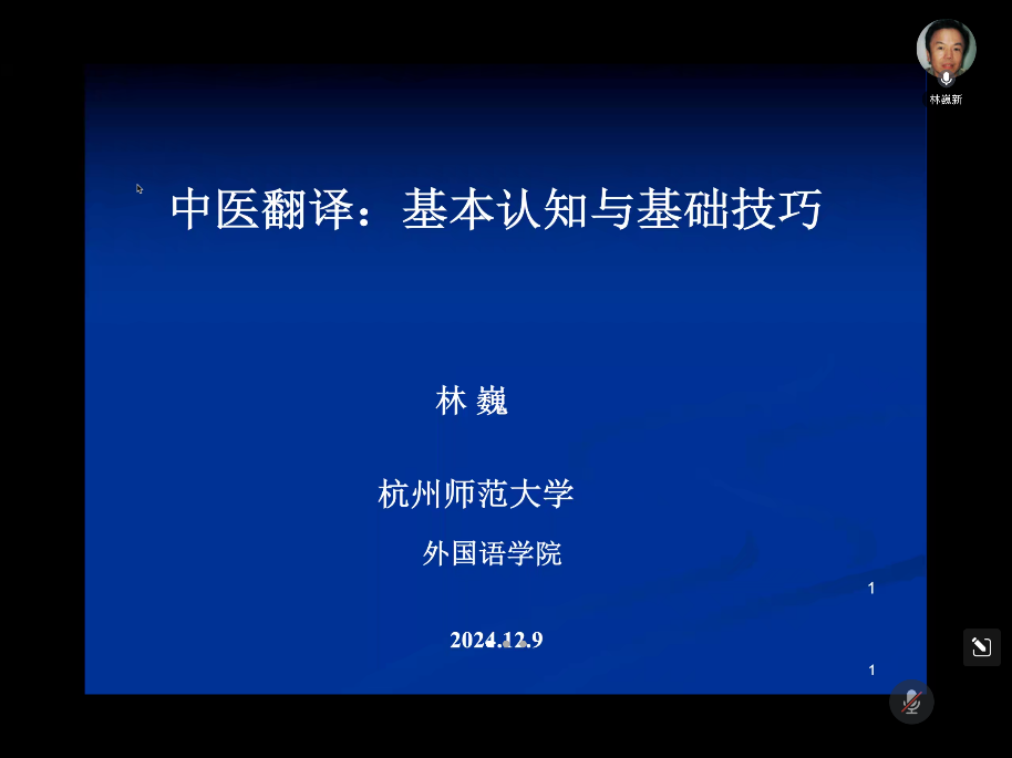 2024年12月9日晚19点,yl23455永利官网特邀杭州师范大学外国语学院林巍教授通过线上腾讯会议方式为yl23455永利官网师生带来“中医翻译:基本认知与基础技巧”专题讲座,讲座由孔祥国副院长主持。