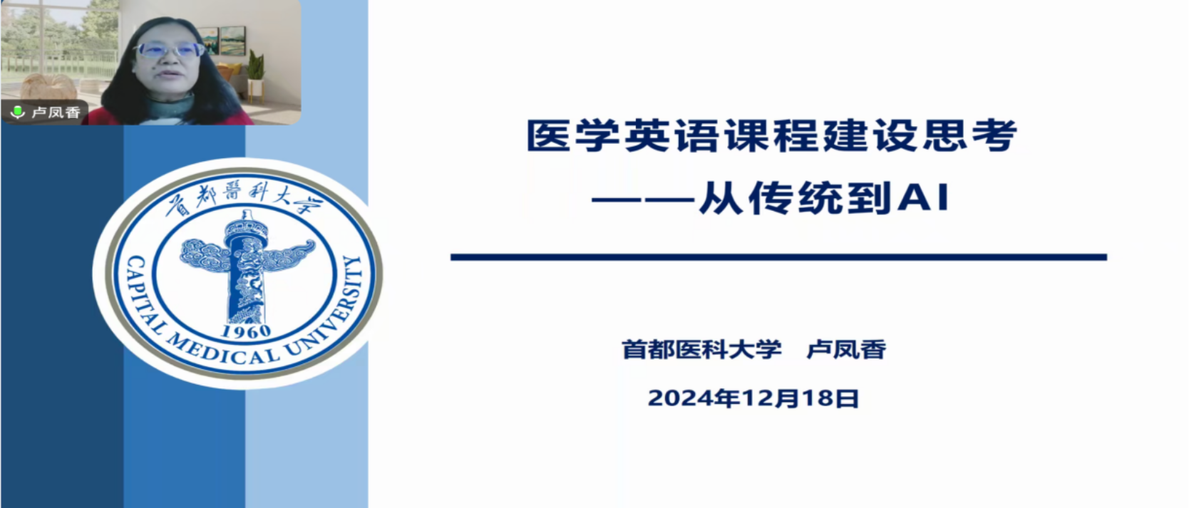 2024年12月18日上午,yl23455永利官网特邀首都医科大学医学yl23455永利官网院长卢凤香教授通过腾讯会议方式为学院英语教师带来题为“医学英语课程建设思考─从传统到AI”的专题讲座,讲座由孔祥国副院长主持。
