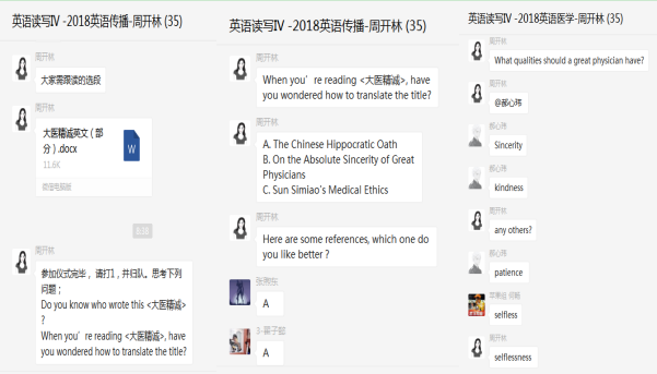 《英语读写IV》课程主讲教师周开林结合开学仪式中诵读的 《大医精诚》选段内容,向学生们介绍了《大医精诚》题目的不同版本译文,引导学生进行比较与分析,并就大医所应具有的特征进行探讨,在英语教学中有机融入中医和中国传统文化,潜移默化地进行了思政教育,增强了学生们用英文表达中国文化的信心和技能。