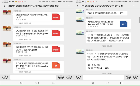 法律系《国际经济法》课程主讲教师杨逢柱、英语系《中医英语》课程主讲教师都立澜等通过轻新课堂和课程微信群等途径提前发布各种教学资料,为学生提供详细的开课说明,介绍课程教学安排中的各方面细节,多次与学生沟通,反复测试教师线上直播、学生线上学习等情况,提前演练线上教学操作系统。为开学第一堂课顺利进行打下了坚实的基础。开课第一天,师生们如约准时上线,在相关平台和课程微信群开展教学活动,线上教学过程顺畅。