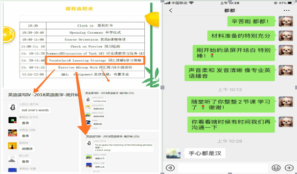 经过第一次上课后的体验,学生们纷纷反馈对线上线下混合式学习模式接受程度高,既能课下通过观看教师推荐的各类平台的课程资源开阔视野,也可以在微信群里和老师与同学开展专题讨论和答疑,还能通过视频形式与老师面对面地即时沟通,大大提高了学习兴趣和学习效率。