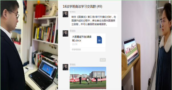 2017级法学班的茹碧娜同学说:“老师为了将最好的课堂呈现给我们,付出了很多辛苦,为了保证网课的效果,搭建老师和同学的沟通平台,不断地寻找方法。非常感谢在网课背后默默付出的可敬的老师,在这场战役中,老师同样也是一道美丽的风景线。停课不停学,在这个特别的假期,我们虽然是宅在家里,但没有停止学习,书桌变成了课桌,这个假期变得更加充实,相信在春暖花开时,我们的课堂将更加精彩”。