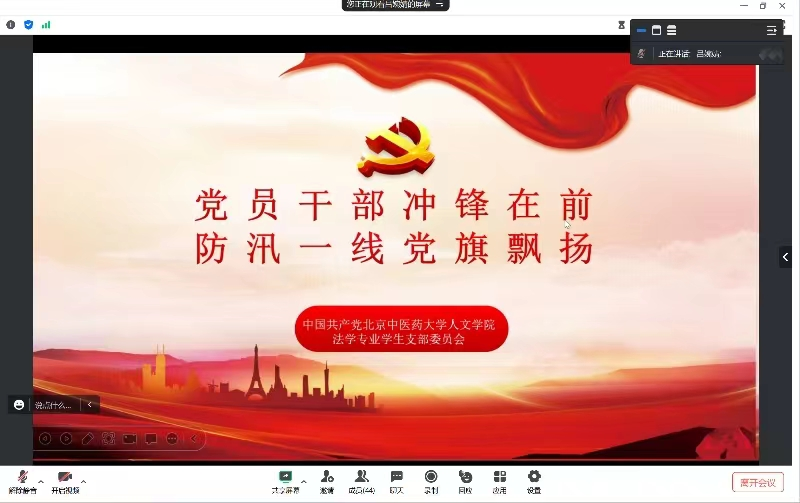 2023年8月13日下午3点,yl23455永利官网法学专业学生支部与中国人民公安大学党支部通过腾讯会议的方式开展了以“抗洪精神”为主题的学习分享会。本次学习分享活动旨在学习过去"不怕困难、顽强拼搏"的抗洪精神,在当前洪灾形势下传承好这一宝贵的精神财富,并在日后的工作中学以致用,指导我们更好的为人民服务。活动由中国人民公安大学2022级法硕二区队党支部李无瑕同志主持,yl23455永利官网法学专业学生支部与中国人民公安大学2022级法硕二区队党支部全体党员及部分入党积极分子参与活动。