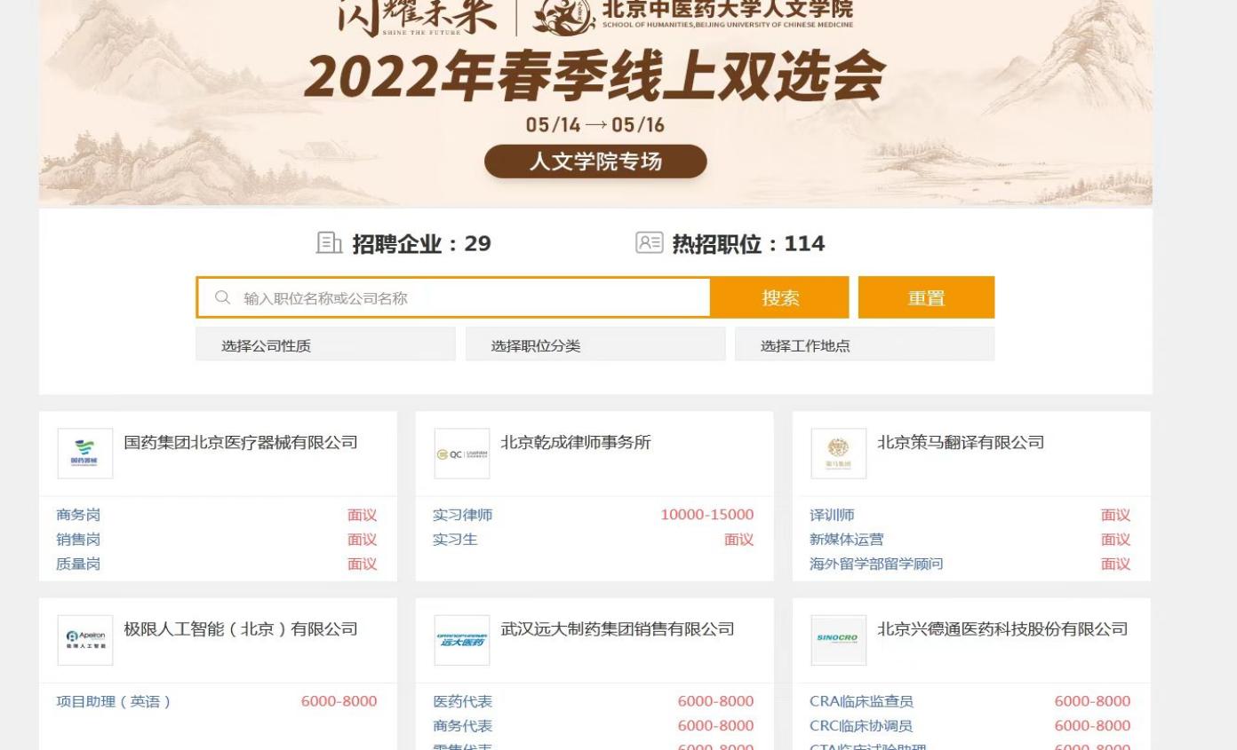 2022年新冠肺炎疫情仍有反复,给毕业生就业工作带来了挑战。为了贯彻落实党中央、国务院关于“稳就业”“保就业”决策部署,抢抓毕业生求职关键期,帮助更多2022届毕业生顺利就业,按照教育部关于举办2022届高校毕业生就业促进活动周的通知要求,yl23455永利官网在五月初举办了毕业生网络招聘宣讲,针对法学专业、英语专业的学生详细介绍了招聘会的岗位,于5月14日—16日顺利组织开展了“2022年yl23455永利官网网络双选会yl23455永利官网专场”,本次双选会依托“医药英才网”平台,采取线上方式举办。